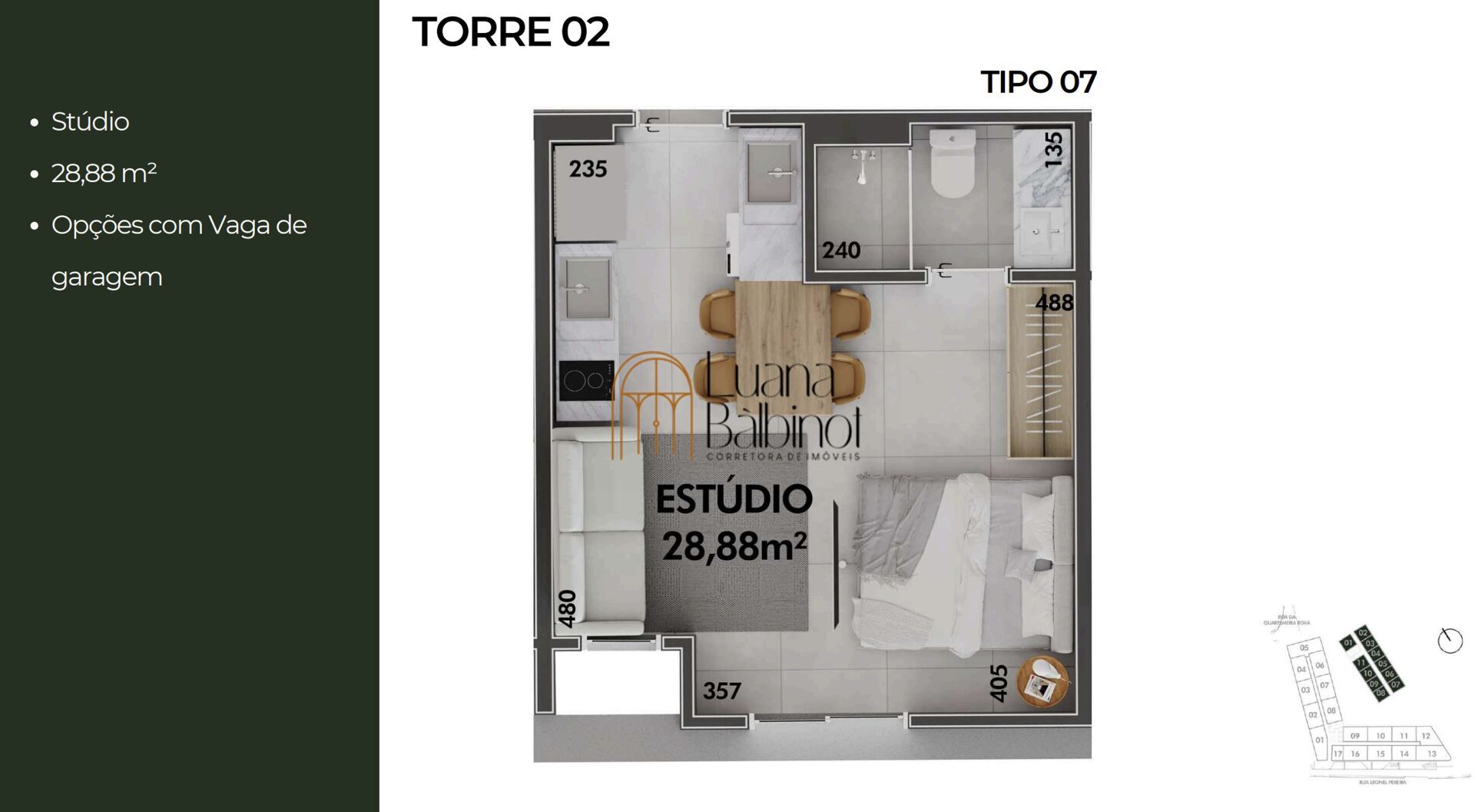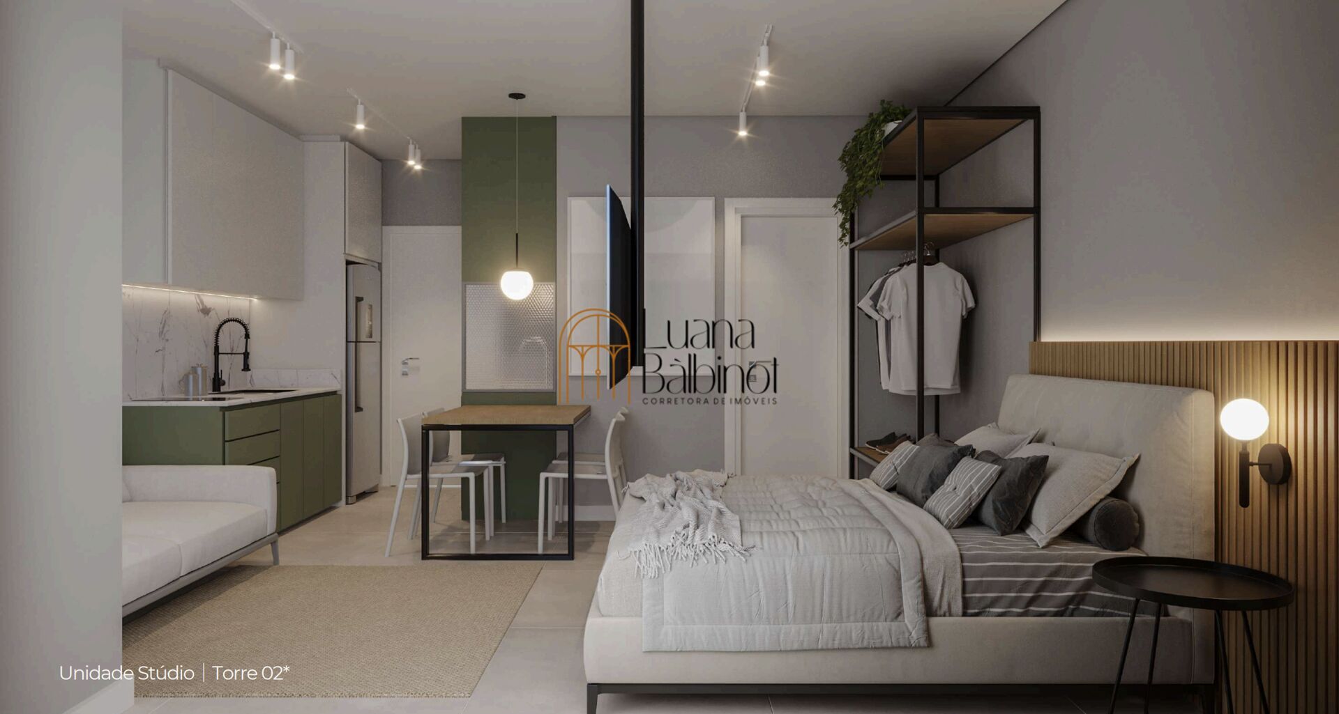 Este studio de 28,88 m² privativos oferece conforto e modernidade, com uma ampla janela voltada para o leste, garantindo ótima iluminação natural, além de 1 vaga de garagem exclusiva.