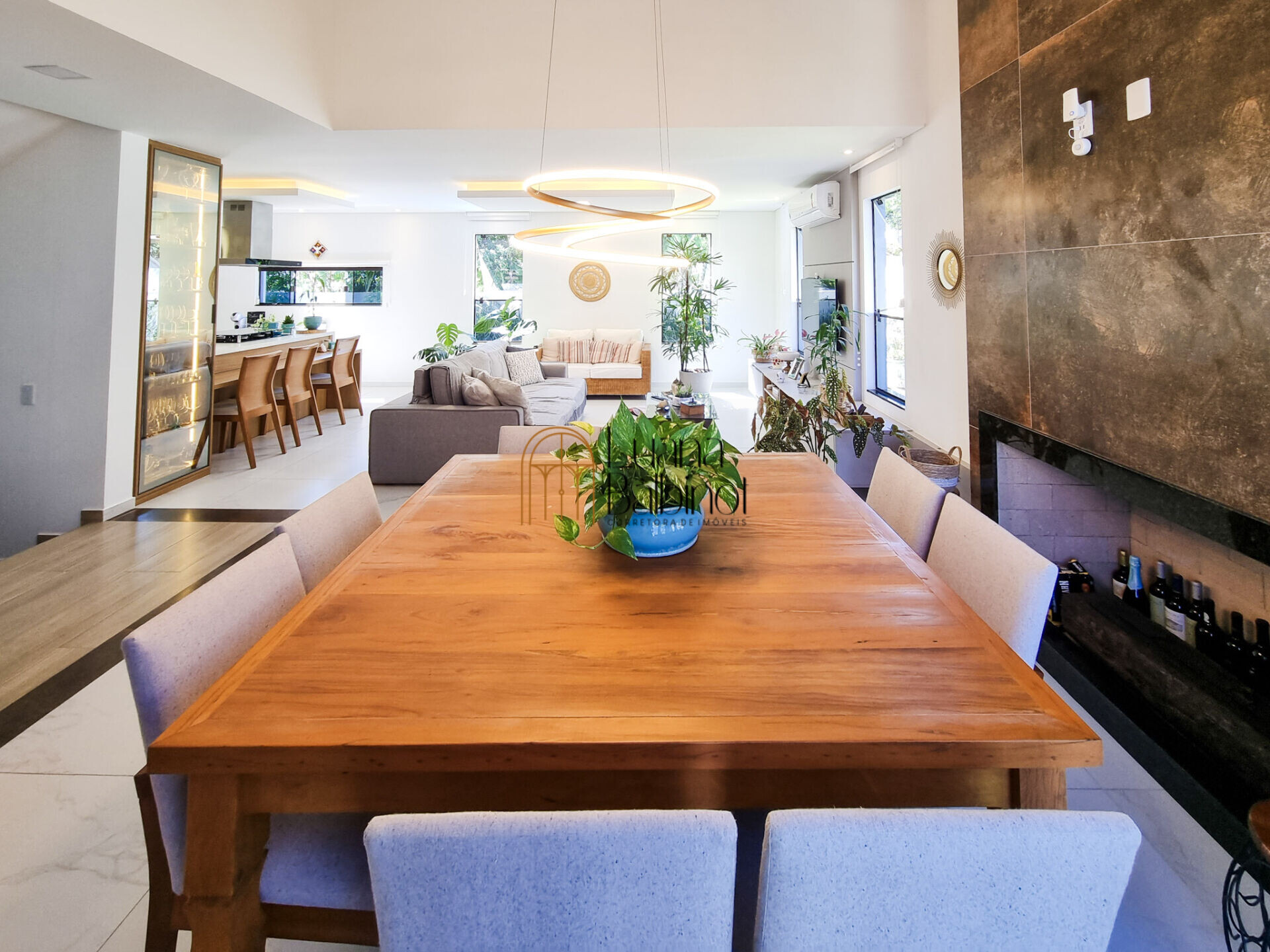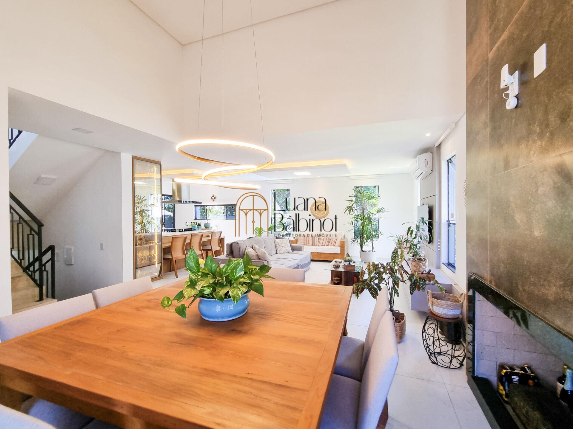 Imagina você entrando na casa, ao entrar você encontra uma linda sala de jantar com pé direito duplo e uma lareira, depois você vê a sala de tv, a cozinha americana com móveis planejados e uma linda bancada em quartzo branco, o fogão fica voltado para o living, proporcionando mais integração com a família e amigos enquanto você prepara uma deliciosa refeição.