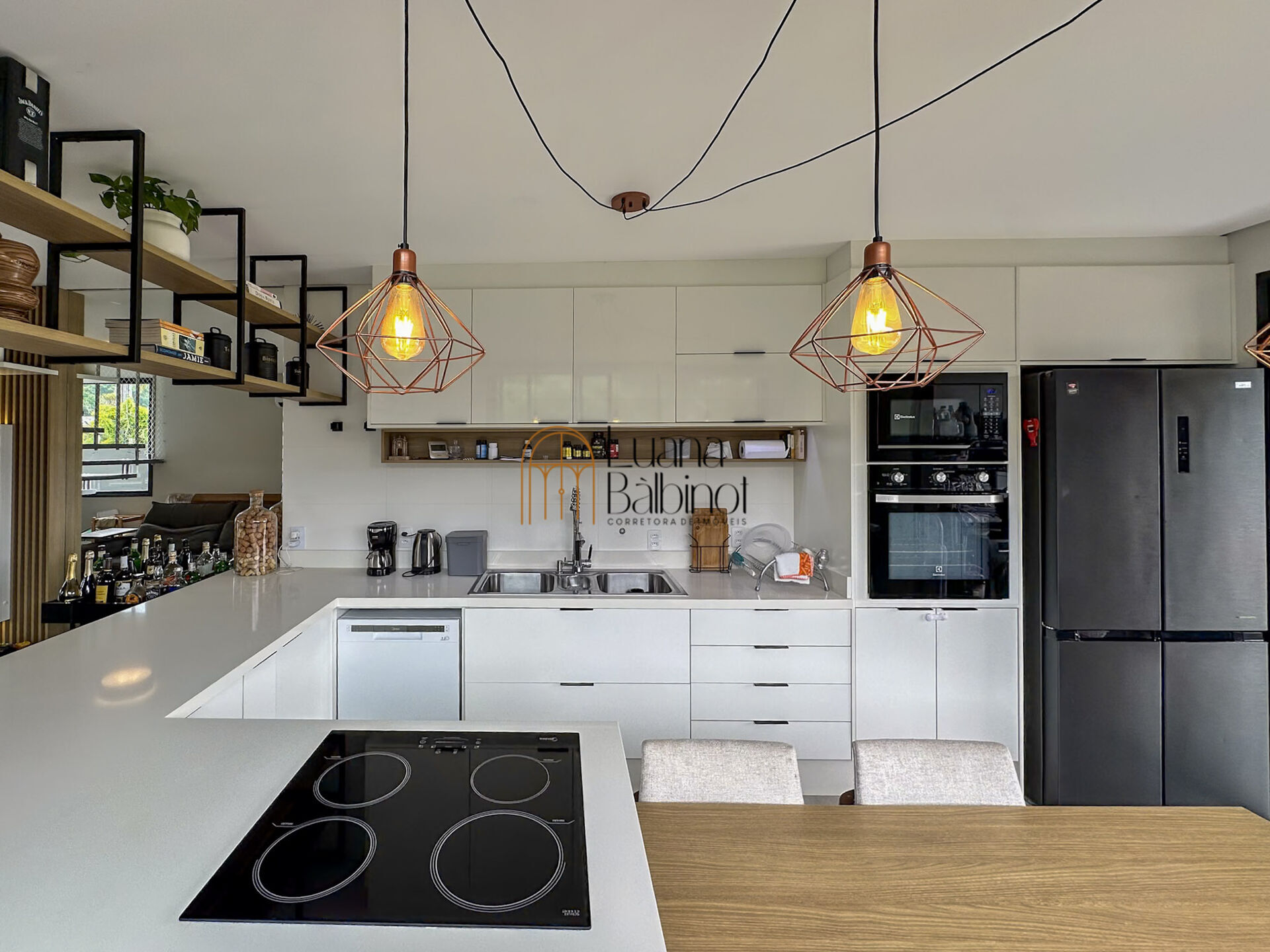 A cozinha equipada com armários planejados e uma bancada integrada com a mesa de jantar é perfeita para refeições rápidas ou para preparar pratos especiais para toda família.